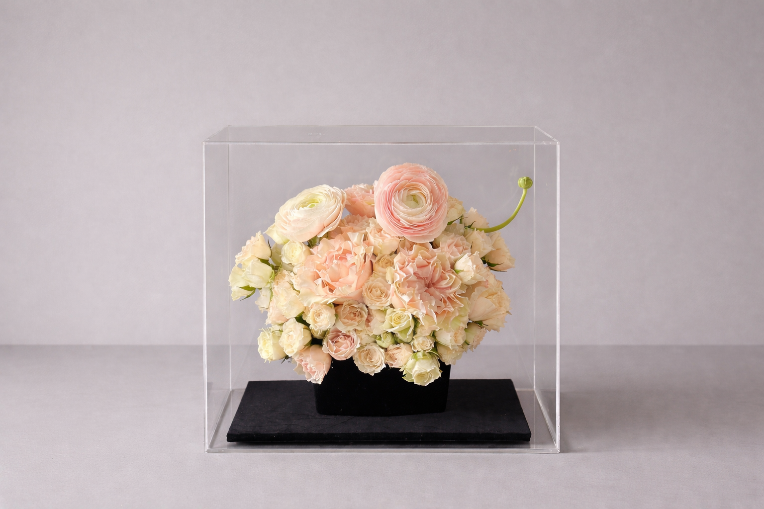 Instead of traditional bouquets, each piece is designed to be presented differently. Every arrangement is structured, composed, and placed within a clear acrylic case, allowing the design to stand on its own from the moment it arrives.